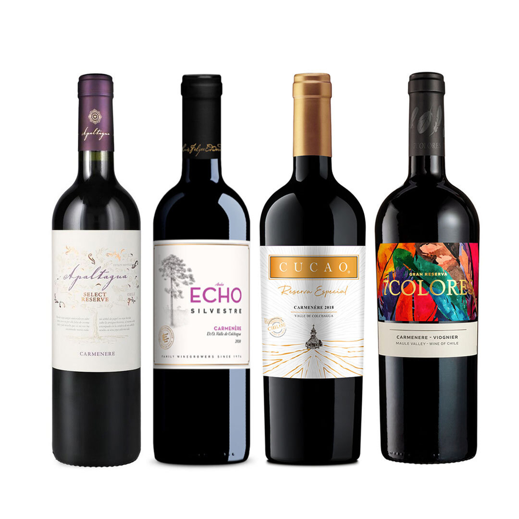 BLACK WINE PACK N°10: Vino Apaltagua Select Reserve Carmenere 750cc + Vino Echo Silvestre Carmenere 750cc + Vino Cucao Reserva Especial Carmenere 750cc + Vino 7 Colores Gran Reserva Carmenere 750cc