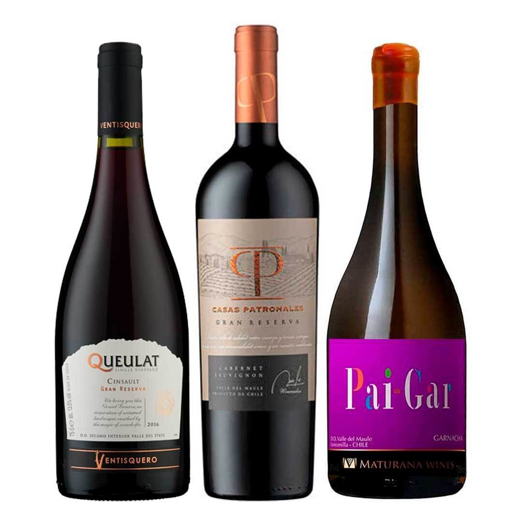 CLUB DE VINOS Nº26: 1x Vino Maturana Pai Gar Garnacha 750cc + 1x Vino Ventisquero Queulat Cinsault 750cc + 1x Vino Casas Patronales Gran Reserva Cabernet Sauvignon 750cc