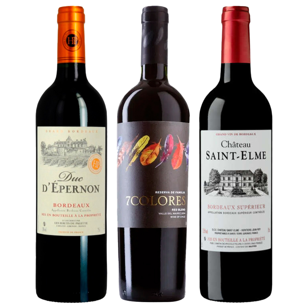 CLUB DE VINOS Nº39: 1x Vino Francés Bordeaux Duc d Epernon Ensamblaje 750cc + 1x Vino Francés Chateau Saint-Elme, Bordeaux, Ensamblaje 750cc + 1x Vino 7 Colores Single Vineyard Red Blend 750cc