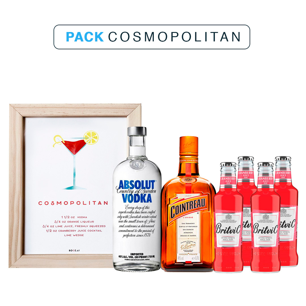 Cosmopolitan: Cuadro Cosmopolitan + Vodka Absolut Blue 750cc + Licor Cointreau 700cc + 4x Britvic Cranberry Juice 200cc