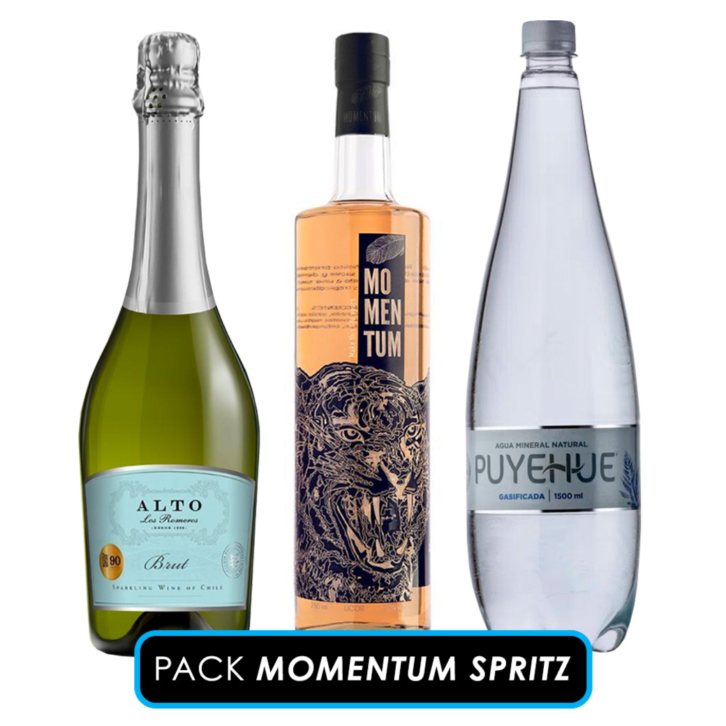 Este pack incluye una botella de Licor Momentum de 750cc, perfecto para darle un toque dulce y frutal a tus cócteles. Además, viene con una botella de Espumante Alto Los Romeros Brut de 750cc, ideal para brindar en cualquier ocasión especial.