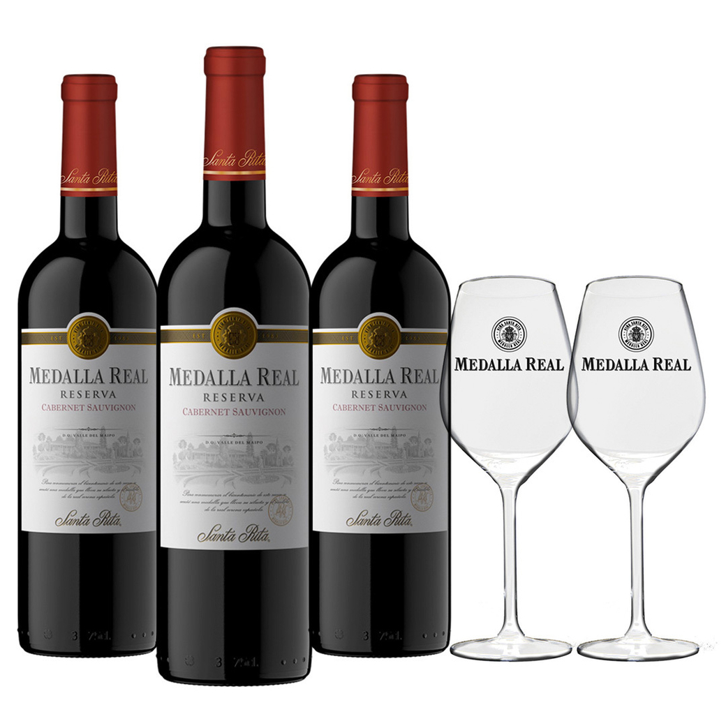 PACK MEDALLA REAL RESERVA + COPAS N°2: 3x Cabernet Sauvignon + 2 Copas Medalla Real