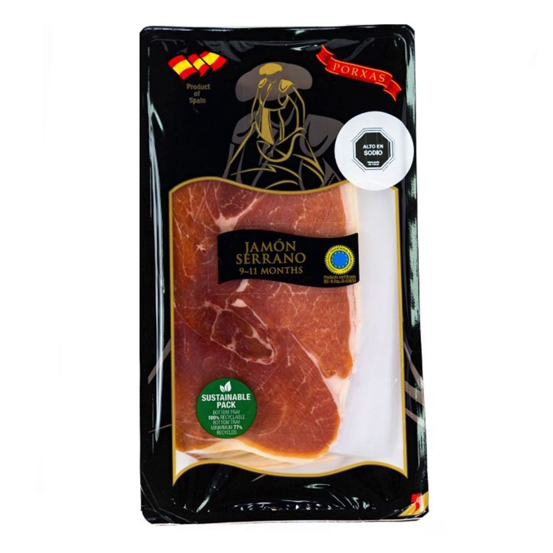 Presentado en un formato de 500 g, el Jamón Serrano Porxas viene envasado en atmósfera protectora y está laminado e interfoliado para conservar toda su frescura y sabor. ¡Atrévete a probar esta joya de la gastronomía española! 🇪🇸✨