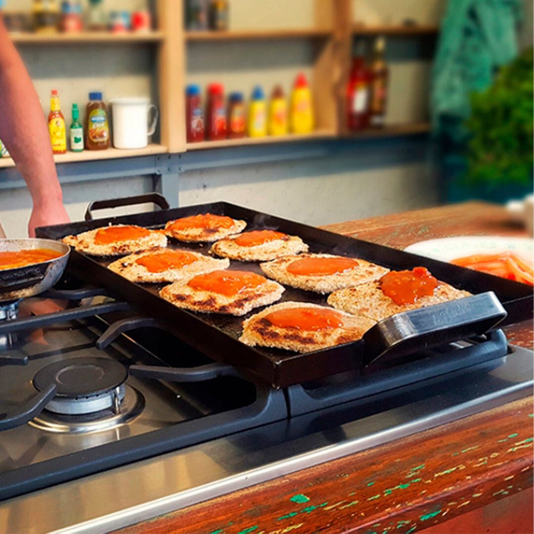 Colócala sobre dos quemadores y precalienta gradualmente para un dorado uniforme. Úsala en cocina, horno, carbón o fuego directo según tu receta: desde fajitas y verduras grilladas hasta mariscos, cortes del asado o un desayuno completo en una sola superficie.