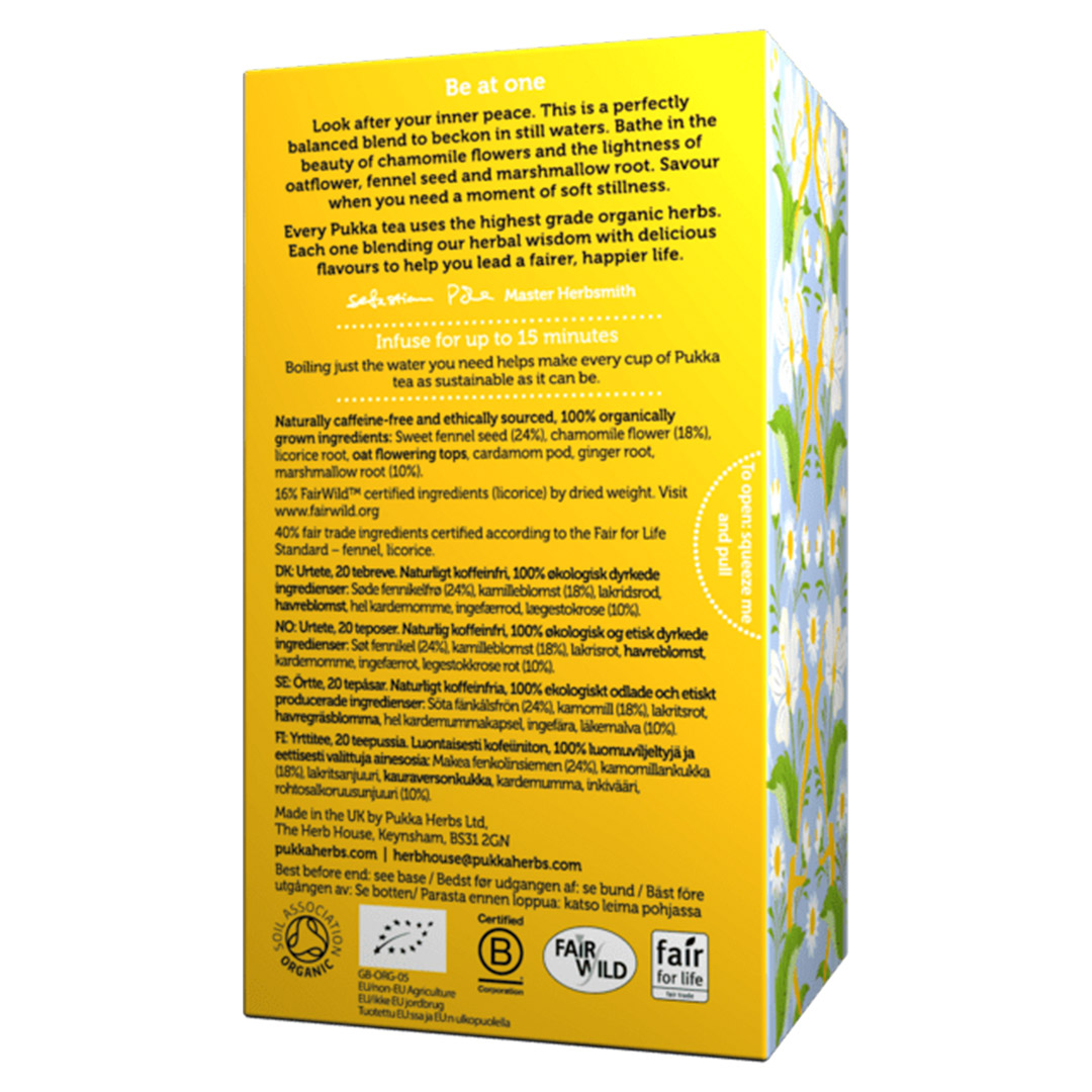 Tómate un momento para ti junto a esta infusión orgánica relajante. La flor de la manzanilla (18%) aliviará tu carga y te ayudará a conciliar el sueño, mientras que el cardamomo y jengibre te brindarán un momento de paz y lucharán contra la ansiedad. Relajarse nunca ha sabido tan bien.