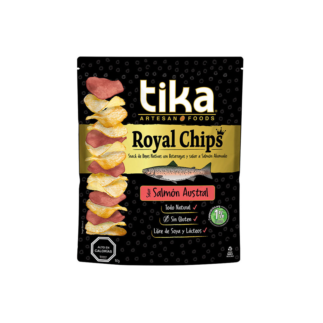 Disfruta de una deliciosa y saludable opción de snack con nuestras Tika Chips Royal Salmón Austral de 180 gramos. Estas crujientes y sabrosas papas fritas están elaboradas con ingredientes naturales y de alta calidad, provenientes de la Patagonia chilena. 🌎